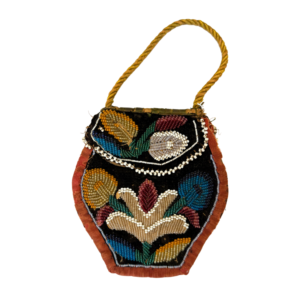 A delicate and finely crafted 19th-century beadwork purse, featuring intricate hand-sewn glass beads in floral and geometric motifs. Likely European in origin, this elegant accessory reflects the refined craftsmanship and fashion sensibilities of the Victorian era.
