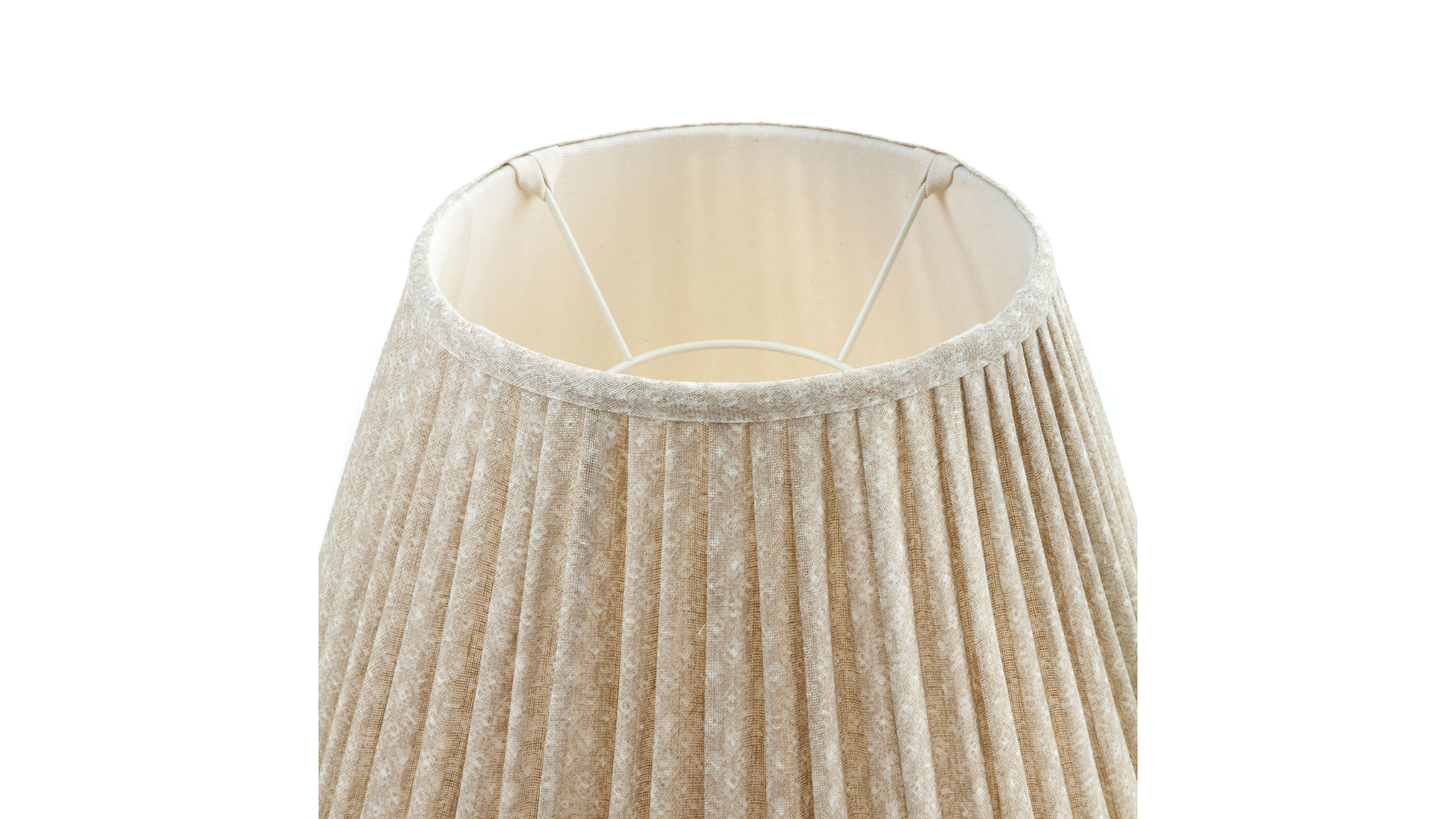 Fermoie Round Gathered Bedwyn Lampshade in Ecru Figured. All Fermoie lampshades are designed and hand-made in their Studio & Factory in Wiltshire, using light linen and light cotton fabrics which are printed in-house.